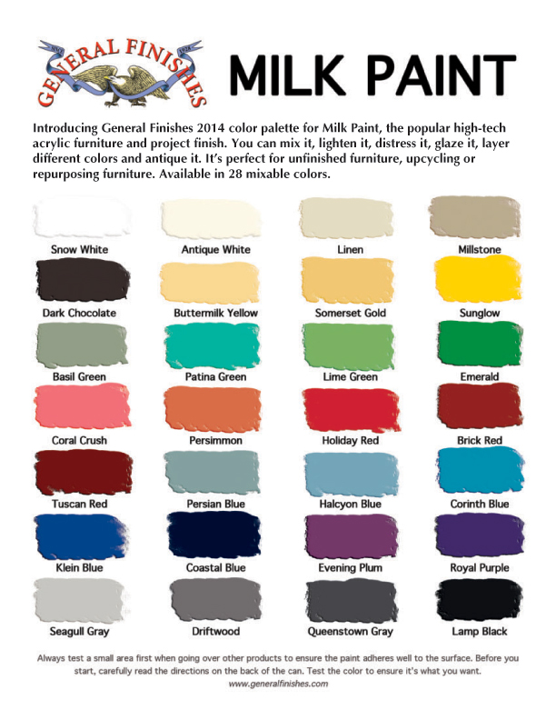 You can choose between our three brands: General Finishes, Faux Real, and Miss Lillian’s. Because the colors in these pictures aren’t all completely true to color, we recommend that you come in the store to see them in person before making your final decision. We may also have new colors in stock that aren’t on the color charts.